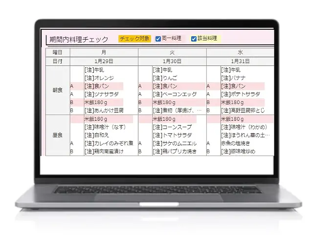 献立作成や検索、栄養・費用管理機能、アレルギー対応できます。