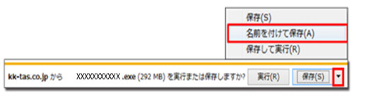 ダウンロード時、【保存】右側の【▼】をクリックして、【名前を付けて保存】を選択し保存先を指定します。